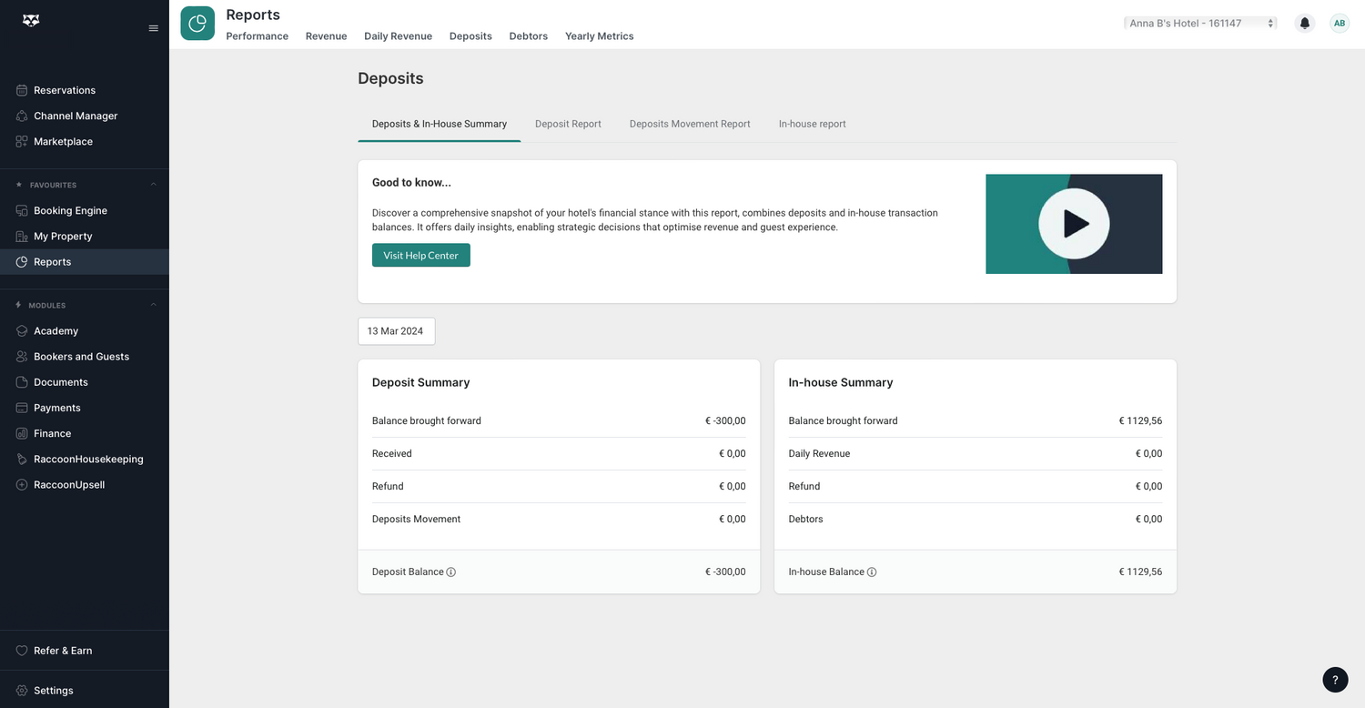Sobald du in die RoomRaccoon-Fokusgruppe aufgenommen wurdest, werden wir die Anzahlungsberichte in deinem RoomRaccoon-Konto aktivieren. Als Mitglied dieser exklusiven Fokusgruppe erhältst du einen frühzeitigen Zugang zu den Funktionen von RoomRaccoon und hast die Möglichkeit, Feedback und Anregungen zu den neuesten Funktionen von RoomRaccoon zu geben.